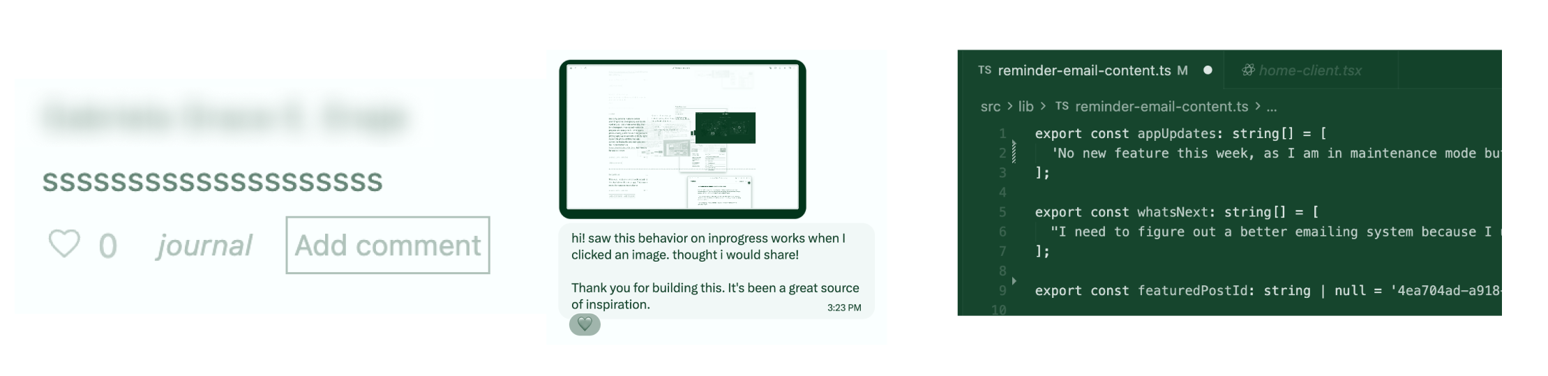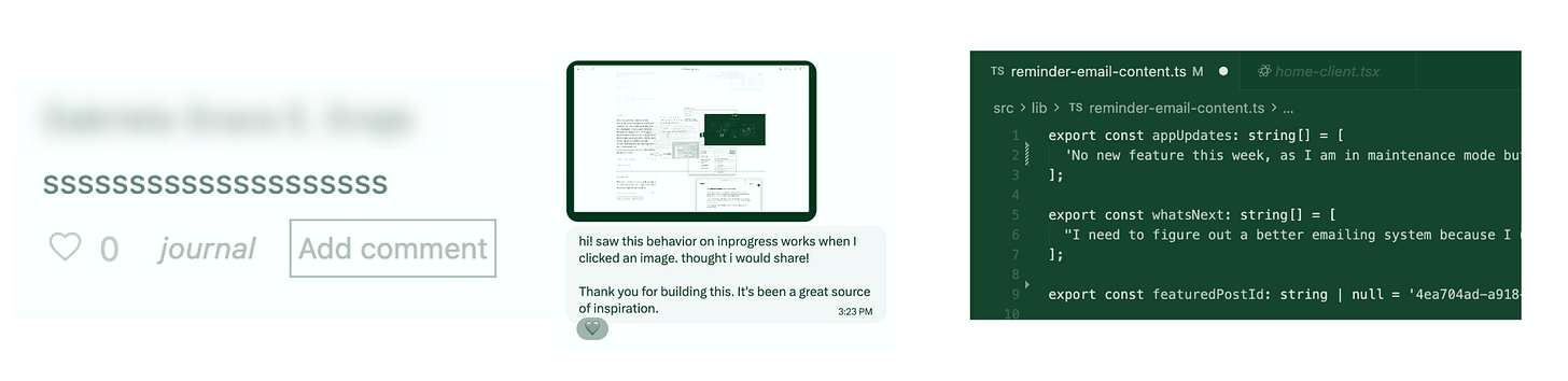 Having users gave a whole new definition to maintenance. Sometimes people would make posts of gibberish just to get past the post wall and I’d delete them. Every week I was committed to fixing, pushing new features, and occasionally figuring out how to route the site to people who might enjoy it. I also made weekly email reminders where I would feature a “post of the week” and announce new functionality. It felt like I was gardening - watering plants, planting new seeds, pruning the weeds, and repairing fences3. The historical “gardens of the internet” - the digital hypertext wikis, literal replications of gardens, couldn’t compare to the weekly active maintenance inprogress.works took.