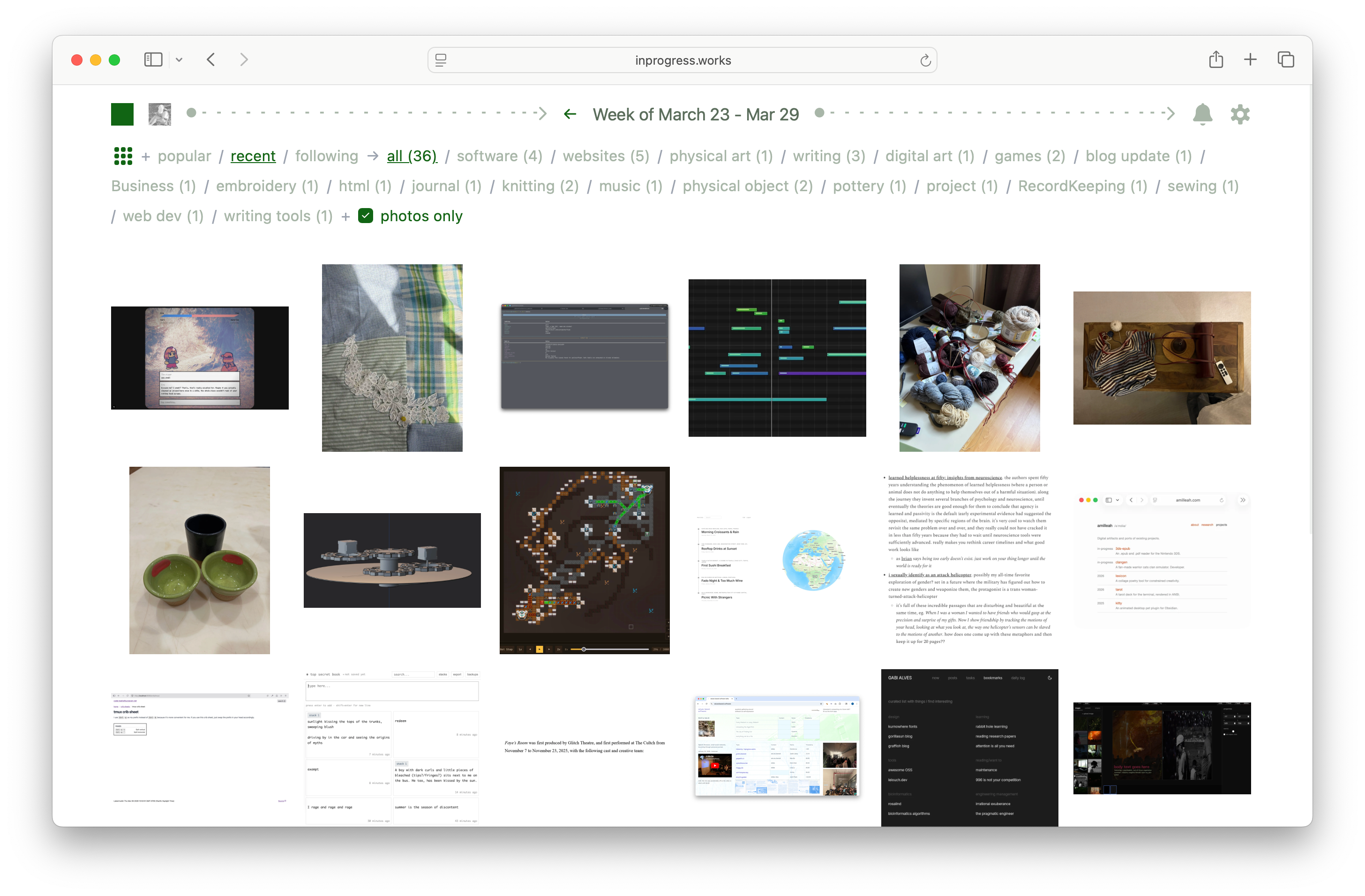 I was so attentive to inprogress.works for most of winter because it felt like I was given one shot. People visit your site once and decide whether they want to log in to check it out. They post once and decide if they want to keep on coming back. I wanted to keep on trying different things while I still could to make inprogress.works unfold closer and closer to my original wish. I wanted to help people find connection through the act of making.4