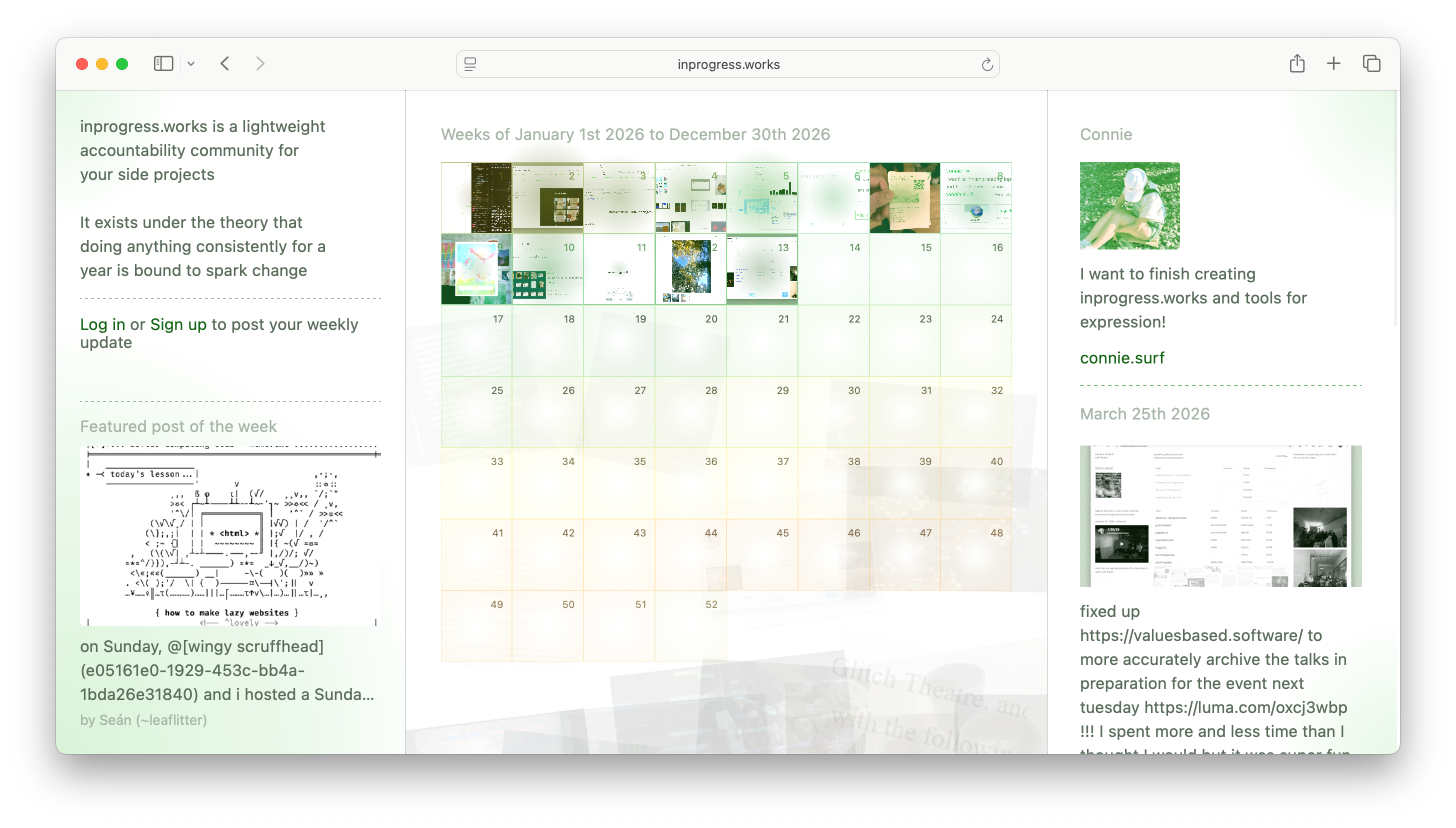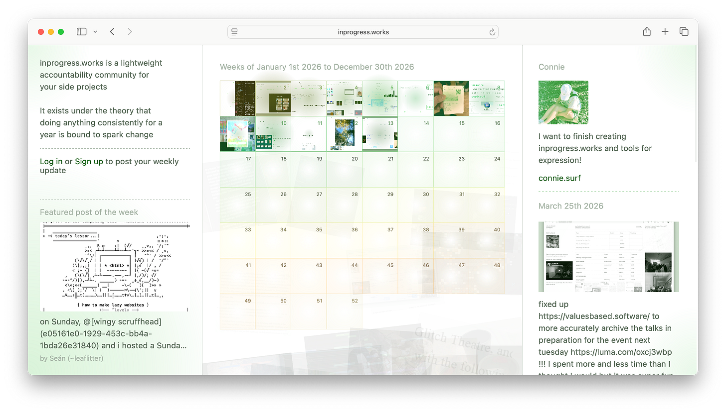 In the depths of winter, I created inprogress.works as a reaction to the slow decline of social media. I had been thinking about it for a long time as every platform slowly got worse and worse. There was the Elon takeover of Twitter, the mimetic echo chamber of the creator economy1, the rise of short form video - all in the name of monetization and growth.